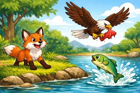 ಅವಳು ಹೀಗೆ ಒಣಕುತ್ತೆ, ಅಳುತ್ತ ಕುಳಿತಿರುವಾಗ ಒಂದು ನರಿಯು ಅತ್ತ ಬಂತು. ಅದರ ಬಾಯಲ್ಲಿ ಒಂದು ತುಂಡು ಮಾಂಸವಿತ್ತು. ಅದು ಬರುವ ವೇಳೆಗೆ ನೀರಿನಲ್ಲಿ ಎರಡು ಮೀನುಗಳು ಜಗಳವಾಡಿ, ಒ೦ದು ಮೀನು ನೀರಿನಿಂದ ಹಾರಿ ದಡದಲ್ಲಿ ಬಿತ್ತು. ಅದನ್ನು ಕಂಡು ನರಿಯು ತನ್ನ ಬಾಯಲ್ಲಿ ಇದ್ದ ಮಾಂಸದ ತುಂಡನ್ನು ಅಲ್ಲಿ ಹಾಕಿ ಆ ಮೀನು ಹಿಡಿದುಕೊಳ್ಳಲು ಹೋಯಿತು. ಆ ಮೀನು ಮತ್ತೆ ನೀರಿಗೆ ಪುಣಕ್ಕನೆ ನೆಗೆಯಿತು. ಇತ್ತ ನರಿಯು ಹಾಕಿದ್ದ ಮಾಂಸದ ತುಂಡನ್ನು ಹದ್ದು ಕಚ್ಚಿಕೊಂಡು ಹೋಯಿತು. ನರಿಯು ಅದೂ ಹೋಗಿ ಇದೂ ಹೋಗಲು ಪೆಚ್ಚಾಗಿ ನಿಂತುಕೊಂಡಿತು. ಅದನ್ನು ಕಂಡು ಆ ಹೆಂಗಸು ನಕ್ಕು “ಅಯ್ಯೋ ಪಾಪ, ಮೀನು ನೀರಿನ ಪಾಲಾಯಿತು : ಮಾಂಸ ಹದ್ದಿನ ಪಾಲಾಯಿತು. ನಿನ್ನ ಮೊಖ ಪೆಚ್ಚಾಯಿತು”? ಎಂದು ಹಾಸ್ಯ” ಮಾಡಿದಳು. ನರಿಗೆ ರೇಗಿ ಹೋಗಿ ಹೇಳಿತು:-